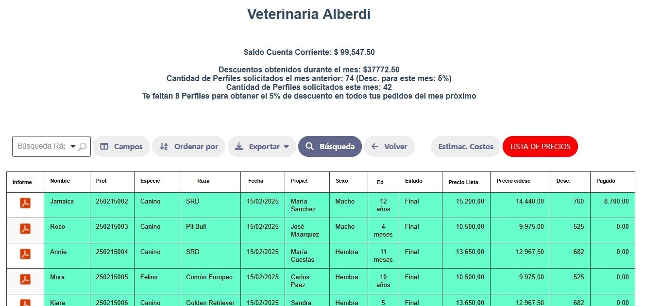 Cada veterinario, cliente del laboratorio, accede a su PLATAFORMA DE AUTOGESTIÓN, en la cual puede abrir los Informes, consultar su estado de deuda, realizar estimaciones de costos y mucho más.